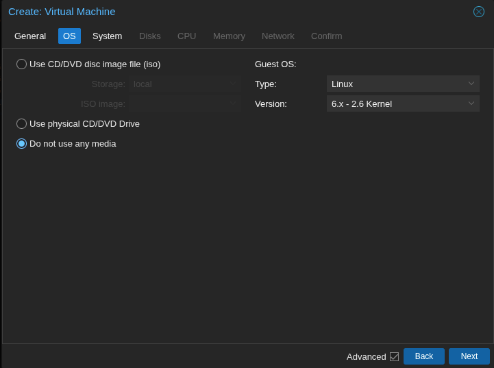 Now go create a new VM within Proxmox. When you get to the OS and hard drive, do not add any media type.