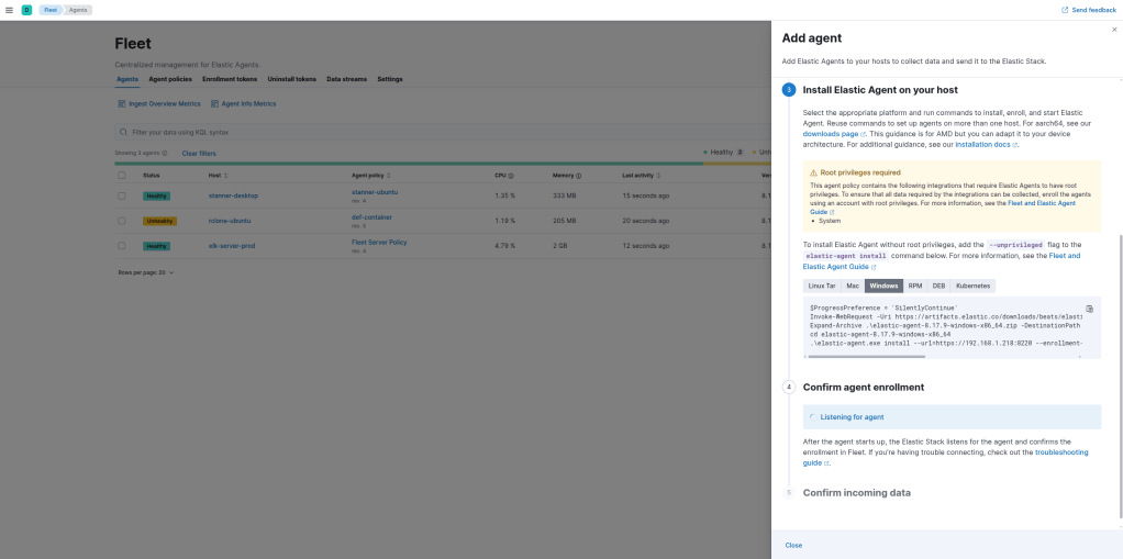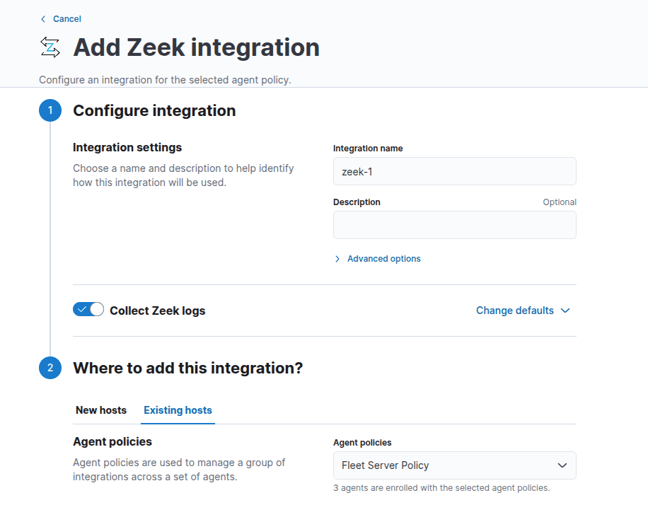 Add the integration to an existing fleet server policy if you are installing it on the ELK server