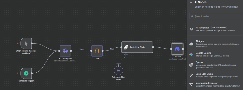 Go back and select “Execute Workflow” to test and run. You should see a message come through into discord if there are any alerts in your environment.