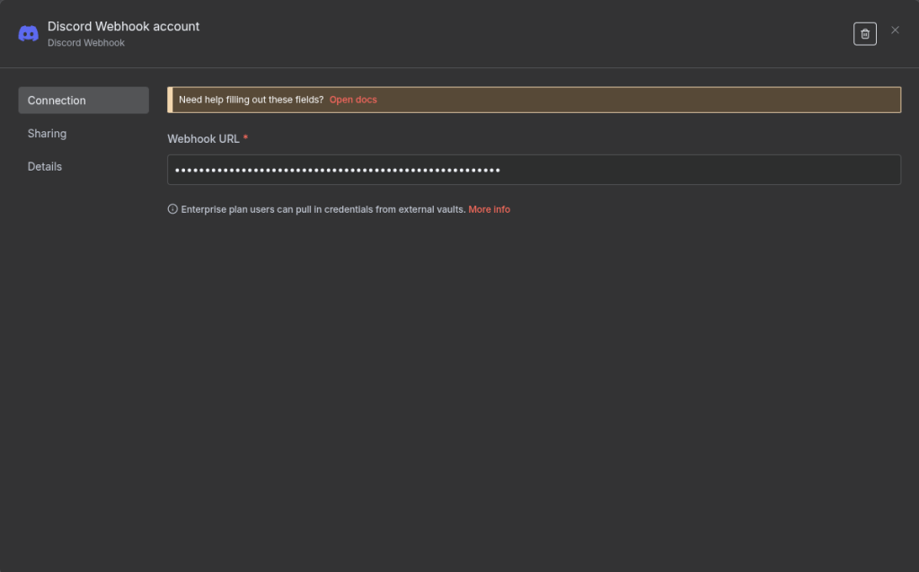 All we need to do to configure the discord node is grab the webhook from one of our chat rooms within our server and add it to the configuration.