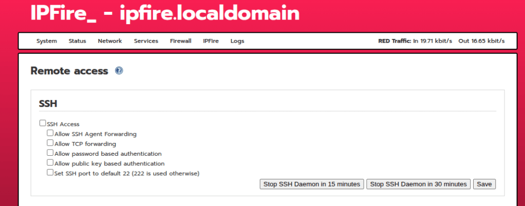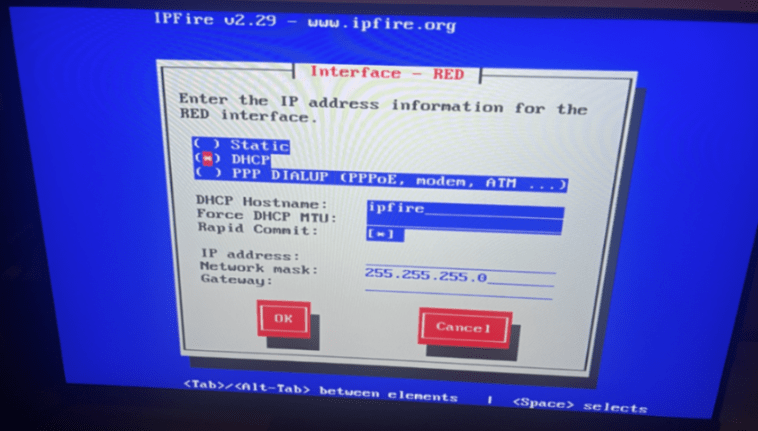 Next configure the red interface settings (use DHCP if your ISP provides a public IP for you and you do not pay for a static one)