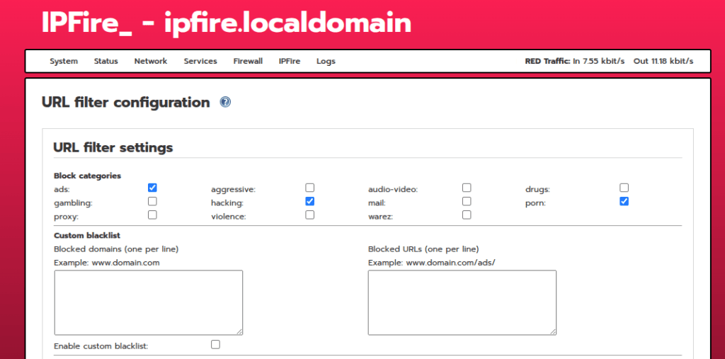 I originally have been using Pi-Hole as my Ad-Blocker, but IPfire has a similar capability. I did not want redundancy here, so I opted to use IPfire’s web proxy and content filter instead. In order to use the content filter, you need to enable IPfire’s web proxy for filtering. Navigate to Network > Web Proxy and enable it on your LAN