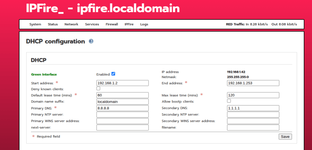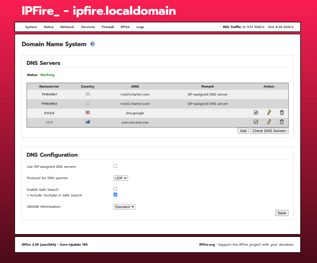 Because this is now going to be the default gateway and act as a DHCP server for your devices, you are going to want to make sure you are pointing IPfire to a couple of known DNS servers like 8.8.8.8 or 1.1.1.1