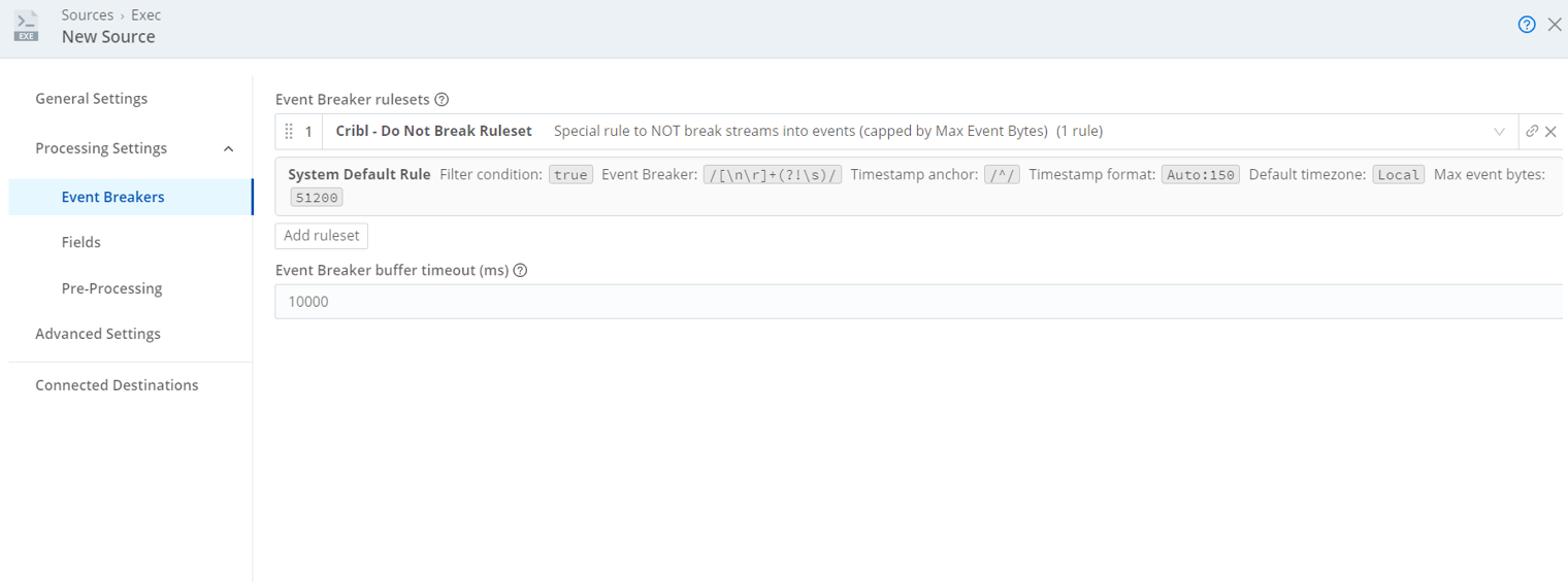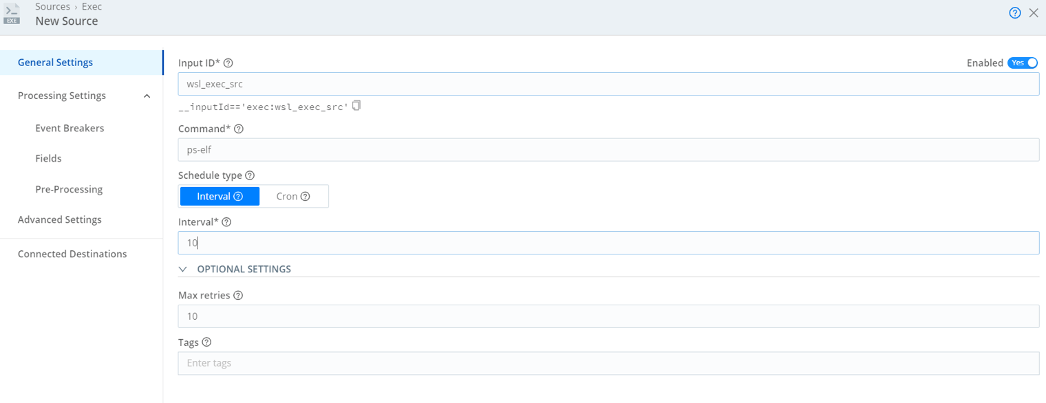 Next, we must add a new source in our Cribl Edge instance. Navigate there and click “Exec” source. This allows you to run a command via CMD and display the logs. Type in a unique name, a command you would like to run, and an interval of your choice.