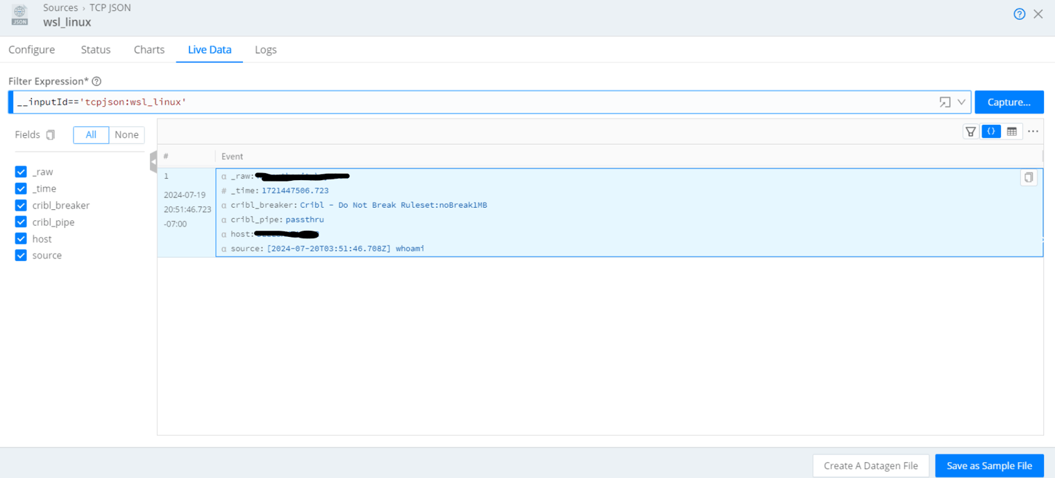 Navigate to your Cribl Stream instance, in Sources > Live Data, click “Capture” and confirm that logs are coming in.