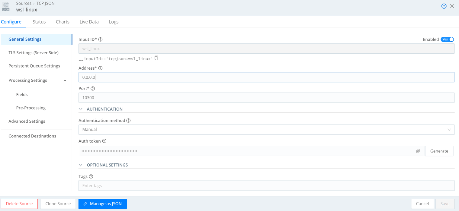 To start, navigate to “Sources” in Cribl Stream and add a source. By using 0.0.0.0 as the IP address, you are instructing Stream to listen to all incoming IPs. The default port used in this example is 10300. Make sure to generate an authentication token and save it for later. Click save and let’s move forward.