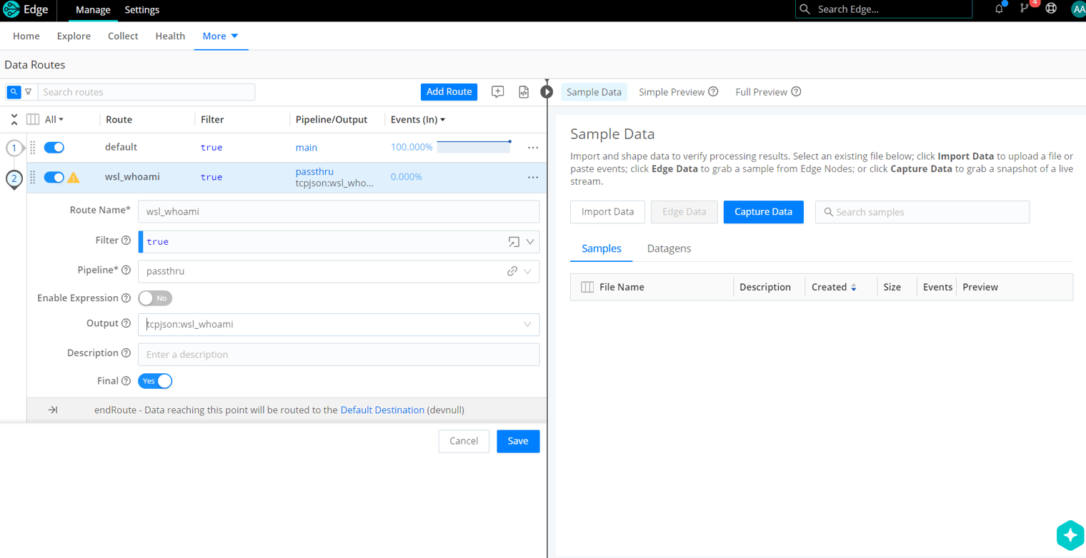 To ensure the data we are generating from our source is being sent to our Cribl Stream instance, we need to deploy a route. Set the pipeline to “passthru” and ensure the output is the same input ID created when building the destination in Cribl Edge.