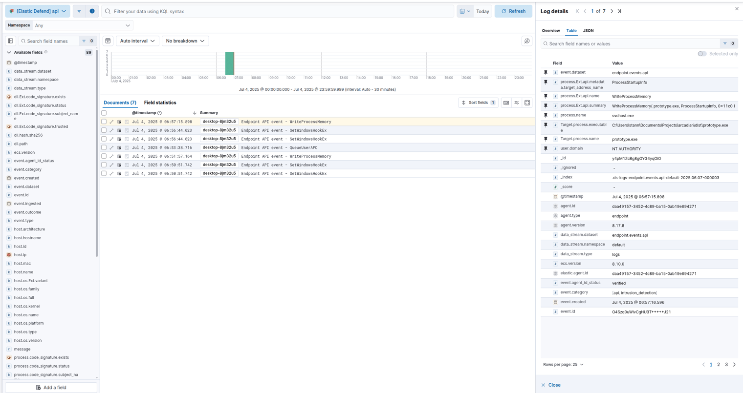 After running the simulations with PurpleSharp, I used the Elastic Defend agent to capture the resulting activity. The agent’s EDR capabilities provided detailed telemetry on Windows API calls.