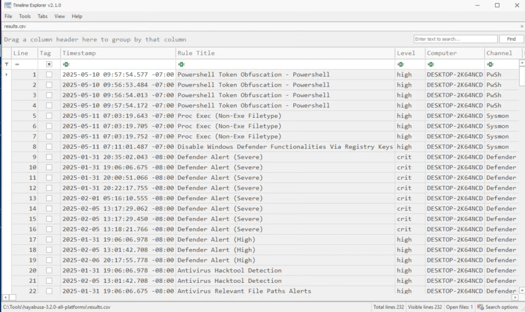 File > Openand select theresults.csvfile you generated. - The tool will load all events and detections from the Hayabusa scan.