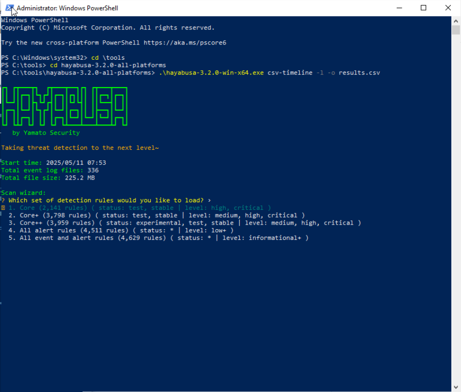 This guide shows how to use Hayabusa to scan local Windows Event Logs for threats and view the results in Timeline Explorer.